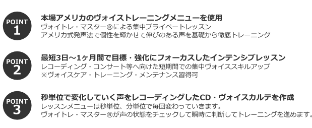 音声学、言語学に基づいた独自のヴォイストレーニングメニューで、個々に合わせた短期集中プライベートレッスン。レコーディング・コンサート・舞台・オーディションなどへ向けた